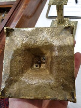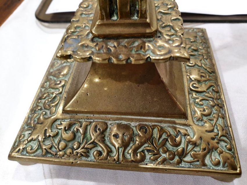 Pair of brass candlesticks of square form with mask and floral decoration, 20cm high and three further pairs of brass candlesticks (8) Condition ReportAdditional Images added. Condition, see photos.