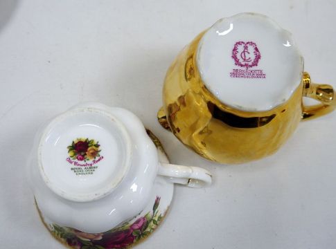 Royal Albert 'Old Country Roses' part tea service to include six teacups and saucers, cream jug, side plates and serving plate and a Czechoslovakian gilt-decorated part coffee service