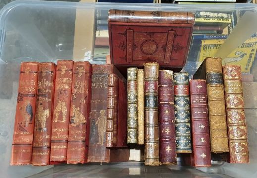 Surtees, R S"Handley Cross or Mr Jorrocks's Hunt ...", illustrated by John Leach, Bradbury Agnew & Co (1854), red gilt pictorial titles and backstrip uniformed with "Ask Mama ...", "Mr Sponges Sporting Tour", "Plain or Ringlets", all with faded backstrips but front boards bright, vol 2 only of "Stanley Henry M in Darkest Africa" and various other antiquarian/bindings (1 box)