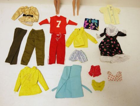 Mattel Barbie doll with blonde hair "Midge", marked "Barbie 1958 by Mattel Sphinx patented" and "Midge 1962/82 (?)" and another Mattel Barbie with brown hair. marked 1958 and various clothes (2)