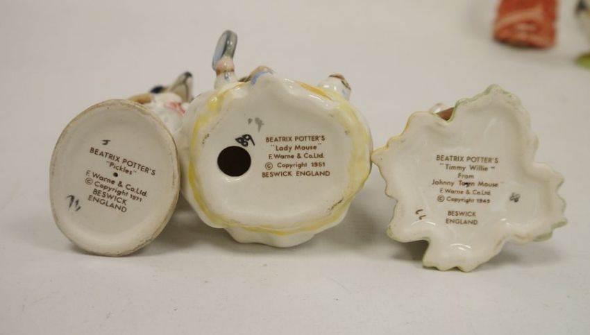 Assorted Beswick 'Beatrix Potter' figures to include Mr Alderman Ptolemy, Lady Mouse, Timmy Tiptoes, Jemima Puddleduck, Sally Henny-Penny, Poorly Peter Rabbit, Simpkin, Timmy Willie from Johnny Town Mouse, Foxy Whiskered Gentleman, Pickles and Tailor of Gloucester and a Royal Worcester blushware dish in the form of a leaf, no.481 in green mark to base (12)