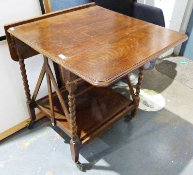 20th century oak folding two-tier tea trolley, marked on ivorine plaque 'Troltab, pat.286458'