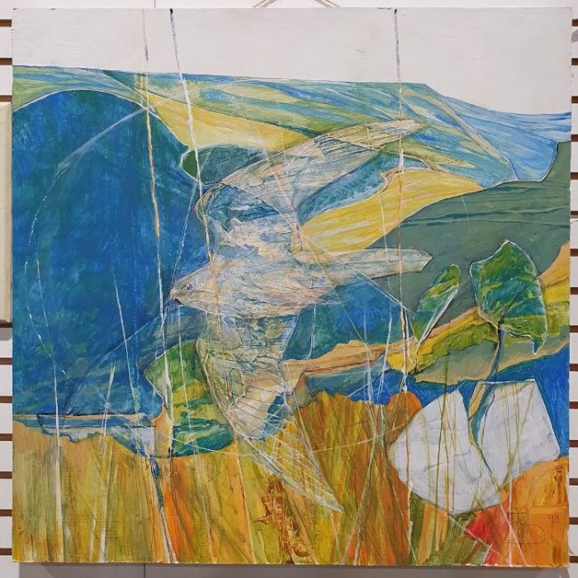 Joan Downs (20th century)Oil on boardKestrel over the moors, signed with monogram and dated '98 lower right, 70cm square