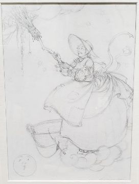 Winifred AckroydPencil studyChildren's illustration of old lady with basket and moon, signed lower right, 31cm x 22cmWatercolour"View of the Road to Gloucester" (2)