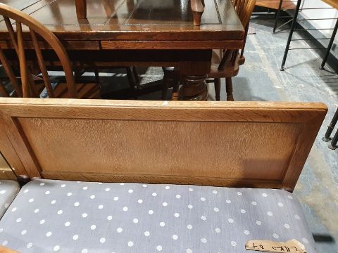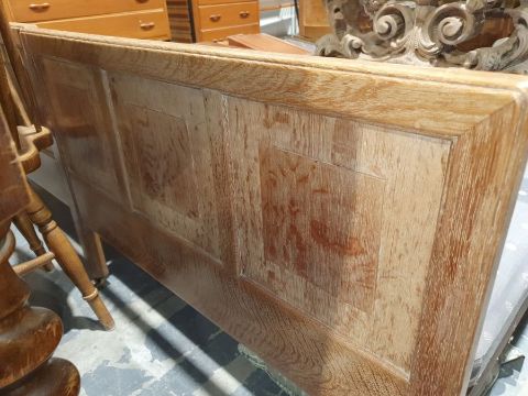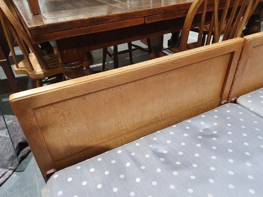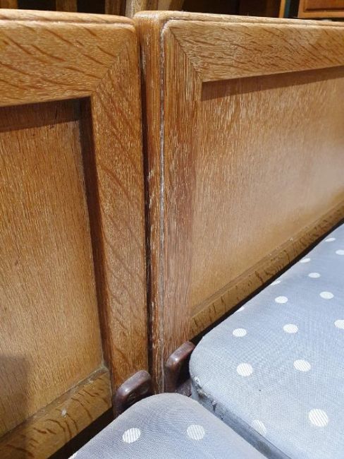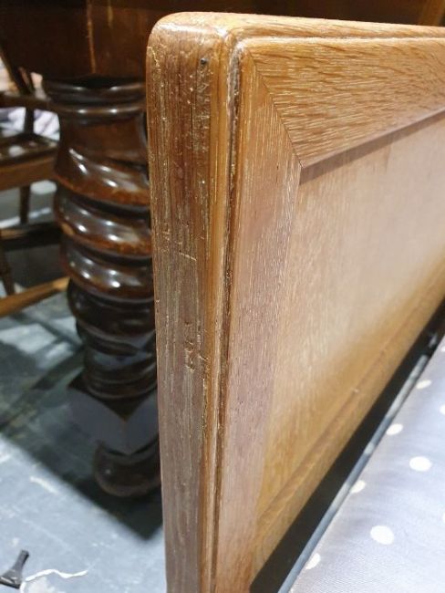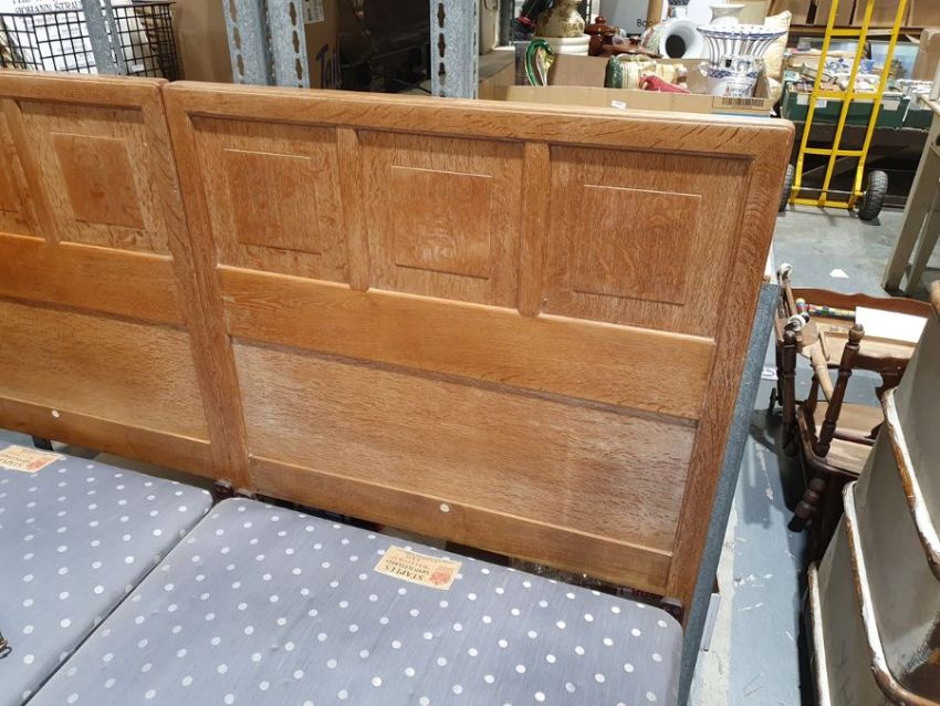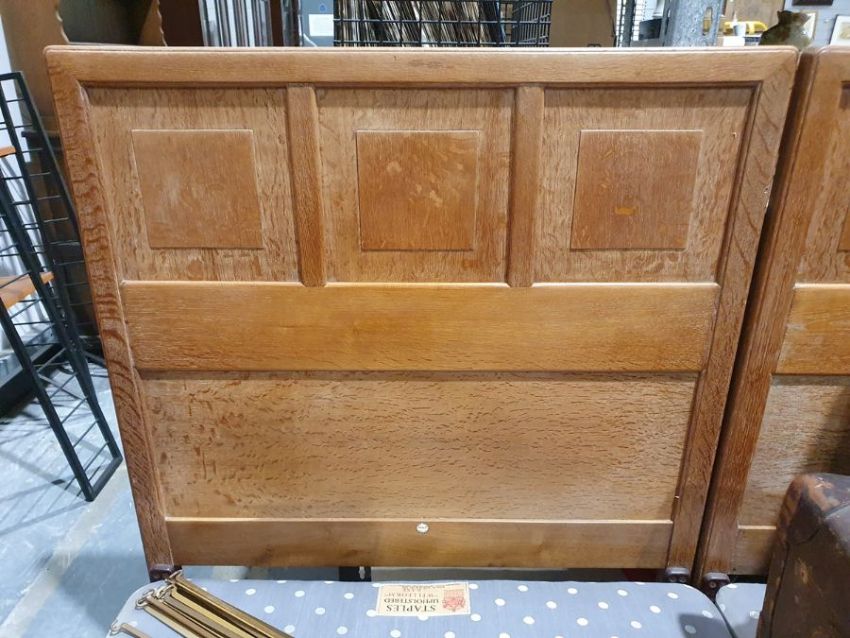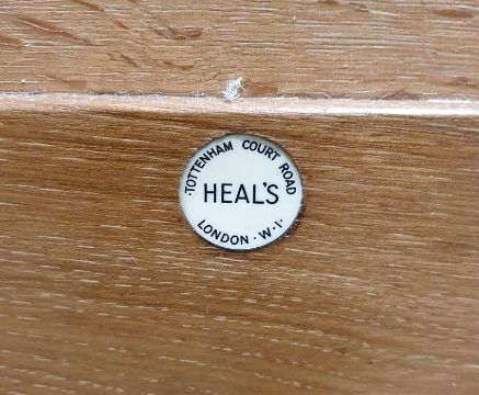 Pair of early 20th century oak single beds by Heals, the quarter-cut oak headboards with ivorine circular plaque marked 'Tottenham Court Road, Heals, London.W' (2) Condition ReportSome light surface scratches and scuffs to the wood, some areas of fading and discolouration. Appears to be complete, see photosInternal bed dimensions are 190cm x 92cm approx. Likely to fit single mattress.