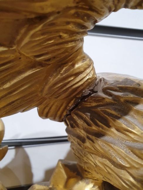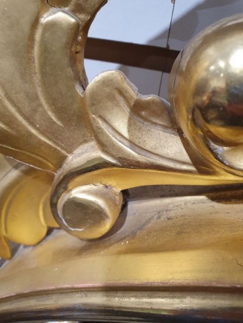 20th century circular wall mirror surmounted by eagle, with a carved giltwood frame, the convex circular plate surrounded with moulded ball decoration, 106cm high Condition ReportSurface scratches and scuffs, wear and areas of loss to the gilt. Areas of loss to the balls, some cracks to the carved scrolls. Both wings are damaged and there is an old repair to the scroll at the bottom of the mirror. See photos