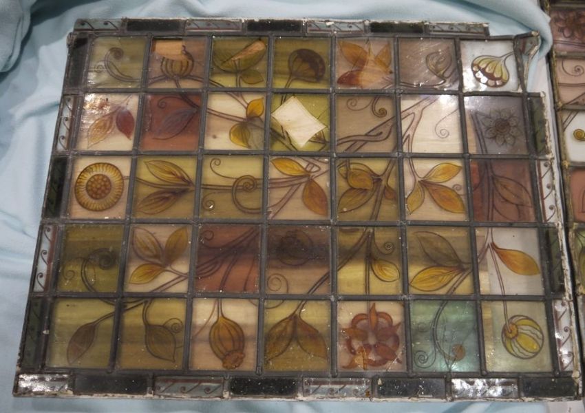 Circa 1880's Aesthetic Movement leaded glass quarries with foliate handpainted decoration (2) Condition Reportphotos added