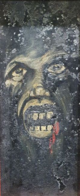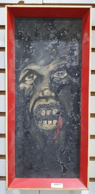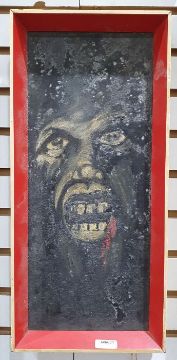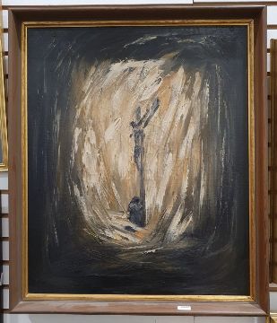 Possibly by John Hutton (1906-1978)Oil on canvasFigure kneeling beneath Christ on the Cross, signed J. Hutton and dated 1957 verso, 54cm x 44cm andSame ArtistOil on canvasSnarling face, signed J. Hutton verso, 34cm x 14cm (2)