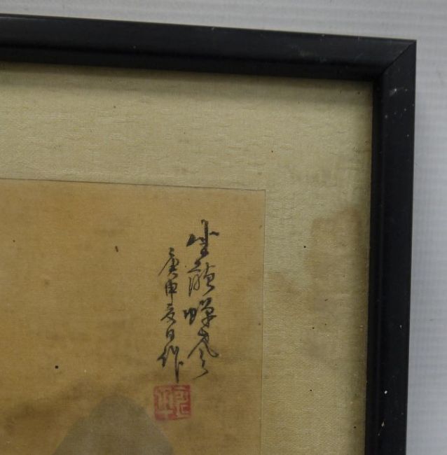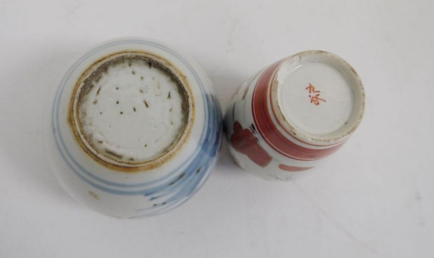 Miniature Chinese blue and white ginger jar, a snuff bottle with dragon chasing pearl decoration, seal mark to base, a squat lidded pot with dragon chasing pearl decoration, four-character mark to base, further ceramics and a Chinese watercolour on silk of figure in landscape, seal mark and inscription to top right corner (7)