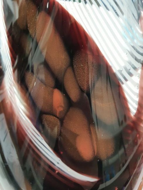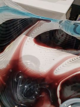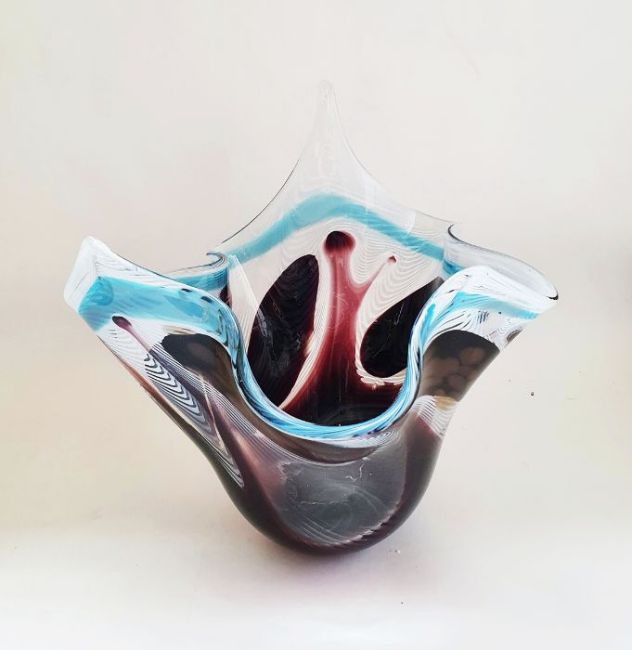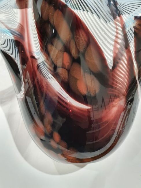 A Murano Fazzoletto glass centrepiece freeform vase with white, burgundy and blue swirls and gold fleck inclusions.Height 36cmDiameter 34cmCondition ReportOverall good condition, some light surface scratches to base. No chips or cracks.