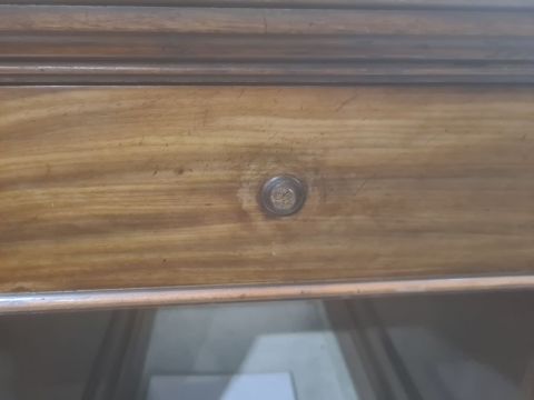 19th century mahogany partner's desk, the rectangular top with rounded corners, moulded edge and inset tooled leather, nine assorted drawers to either side, raised on plinth base, 200cm wide Condition ReportOne of the drawers is missing most of the handle, another two handles are damaged and one further is loose. Only 4 of the drawers have locks but the locks seem to be complete. There is some staining to the leather on top as well as some wear. There is a big scratch to one side. There are spots of wear throughout. See attached images.