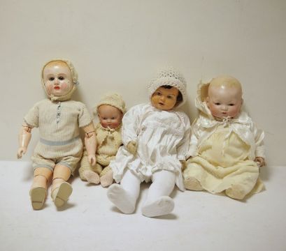 Two composition baby dolls, a bisque headed baby doll with painted features and a composition doll with cloth body (4)