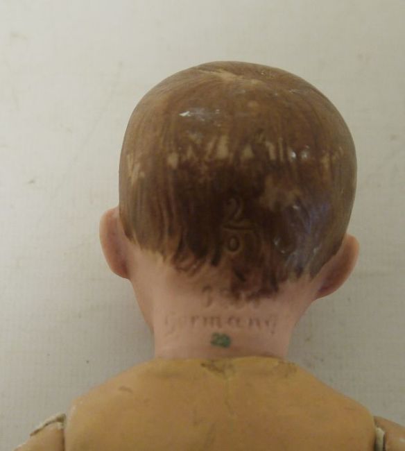 Heubach bisque headed baby doll with jointed composition body, no. 76/02, 26cm high, another Heubach Koppelsdorf bisque headed doll, 18cm high, bisque headed baby boy doll and a bisque porcelain doll's body (4)