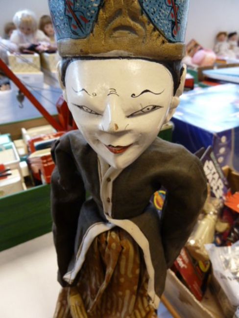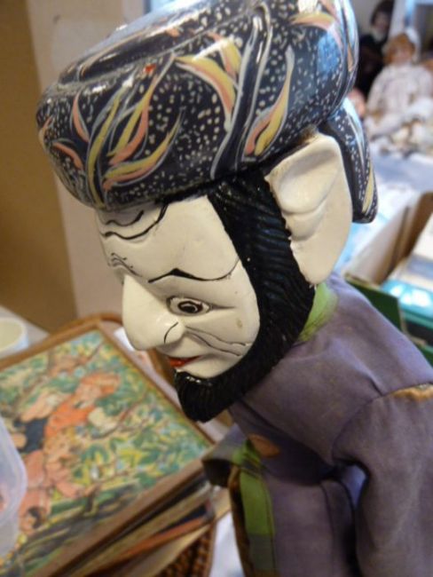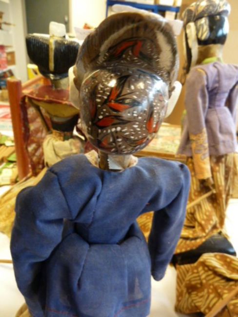 Set of four Eastern painted wood puppet dolls, each on a stand and with arms operated by wooden rods, all dressed in printed cotton skirts and jackets, the tallest 40cm high (4) Condition Reportsee images