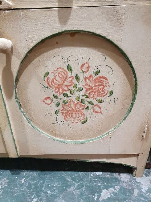 20th century painted dresser with open shelves above two drawers, two cupboard doors, 106cm x 206cmCondition ReportSurface scratches, scuffs and knocks, some areas of staining and discolouration, areas of loss to the paint, some holes in the wood, see photos