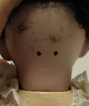 A bisque head baby doll, with composition body, closing eyes and open mouth, marked to back of head '38'