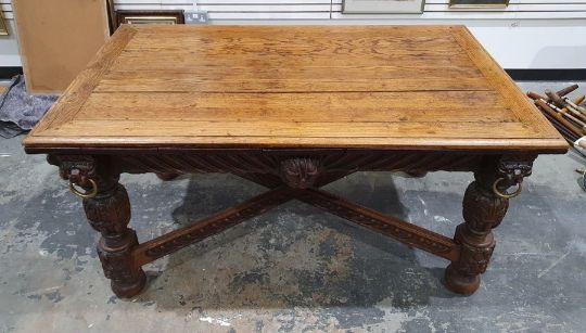 Early 20th century oak draw-leaf table in the Victorian Gothic taste, the base with lion masks, heavily carved legs and X-shaped stretcherCondition ReportLength approx 160cm (extended approx 292cm)Width approx 96cm