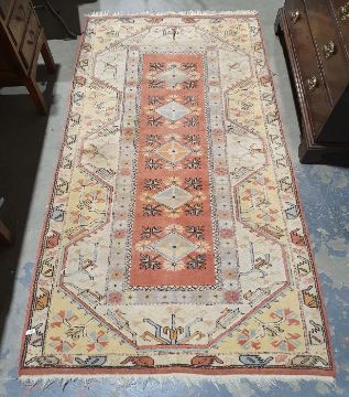 Eastern-style peach ground runner with repeating medallions to the central field, on stepped border, 216cm x 124cm