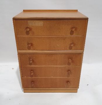 Mid century modern Meredew oak chest of five drawers, on plinth base, 76cm wide
