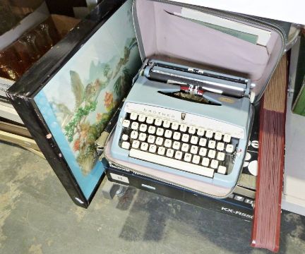 Chinese Swatow shell cutting picture of a landscape, another, a Brother Deluxe vintage typewriter, a Panasonic electric typewriter, three cutlery sets, two large Chinese fans and various china and household items (3 boxes)