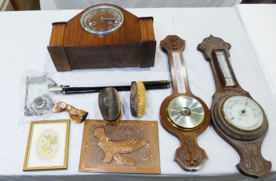 Benito wooden cased mantel clock, two barometers, various chinaware and linen (3 boxes)