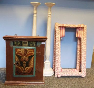 A painted cupboard, a pair of of large wooden floor standing candlesticks and two luggage racks