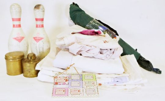 Pair of AMF ten pin bowling pins, two brass jars and a quantity of linen (1 box)