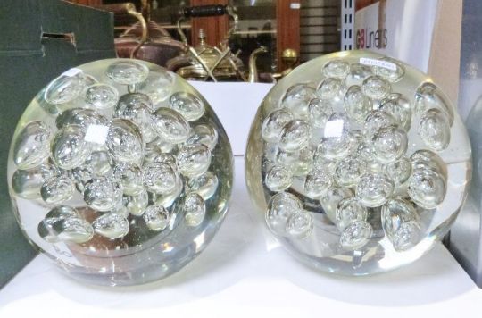 Pair of modern large round glass paperweights together with a box of books