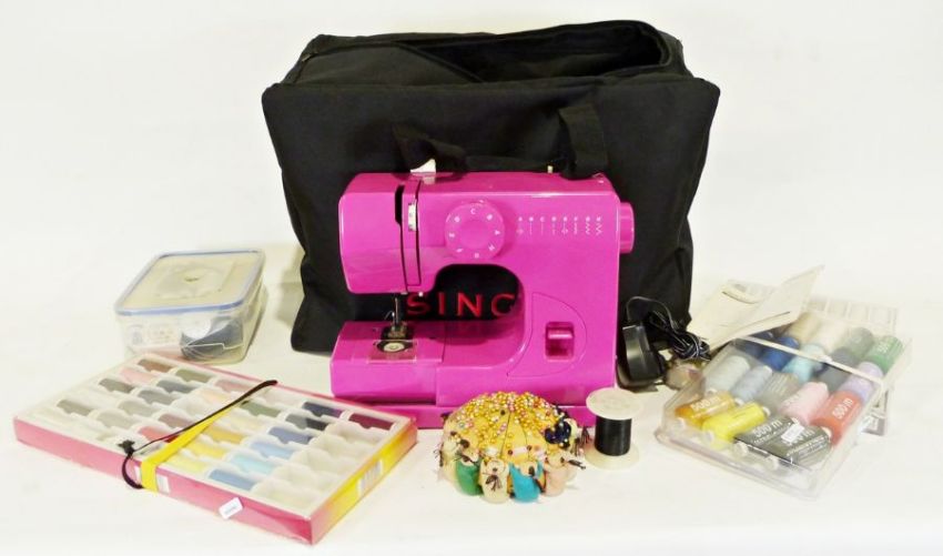 Various Chinese silk items and linen and an Argos sewing machine (2)