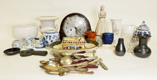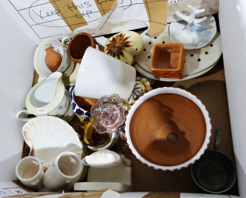 Smiths wooden-cased mantel clock, nine Danish stainless steel trinket dishes and candleholders and various china, glass and wooden objects (4 boxes)