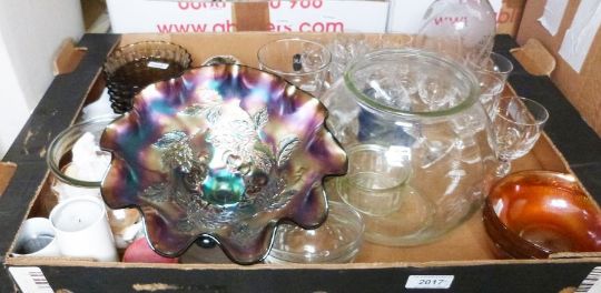 Carnival glass bowl, a glass decanter with etched grape and vine decoration and further glassware and chinaware (2 boxes)