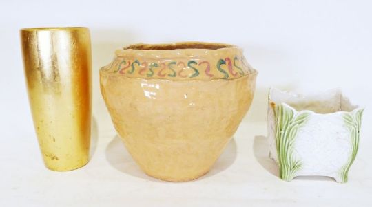 Studio pottery jardinière signed J S and dated '85 to base together with a modern vase and a ceramic jardinière (3)