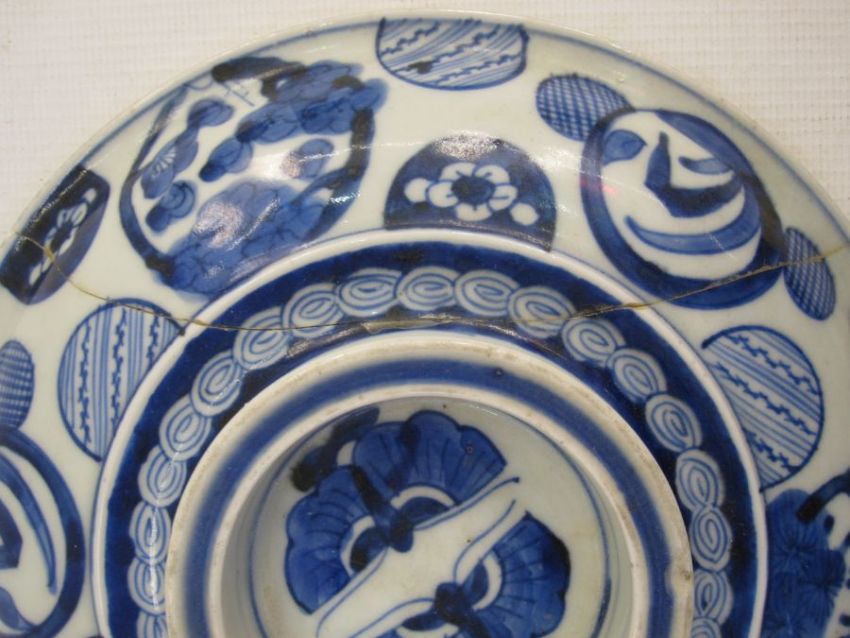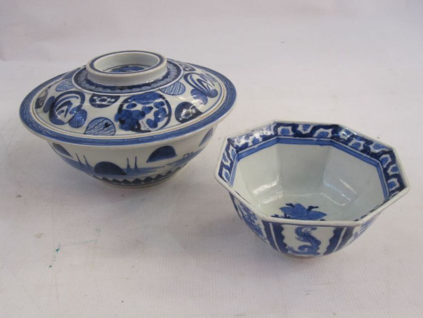 Chinese porcelain bowl and cover with underglaze blue lakeside decoration to the bowl and circular symbols to the cover, 23cm diameter and a Chinese porcelain octagonal bowl with everted rim and underglaze blue decoration of dragons, prunus blossom in panels, 15cm wide (2)