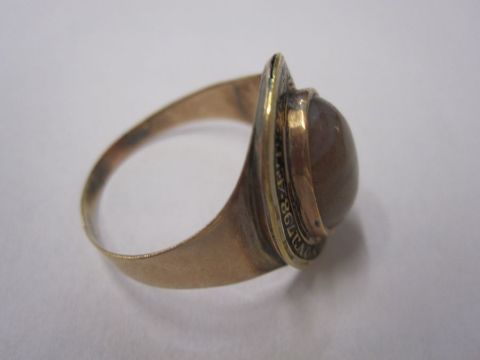 Georgian gold, enamel and agate mourning ring, oval, the cabochon agate surrounded by black and gilt enamel inscription, dated 1798Condition ReportApprox size 'T'