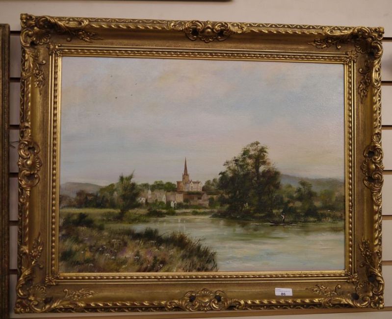 A T AveryOil on canvasContinental river scene with spire in background and a gentleman punting down the river, signed lower left 'A T Avery', 23cm x 59cm