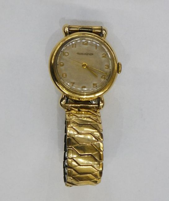 9ct gold Jaeger Le Coultre gent's wristwatch, the inside back cover numbered 455149 and 12872, probably 1950's, the case 32mm diameter, on expanding gilt metal strap