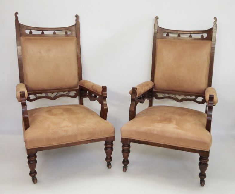 Pair of late Victorian oak-framed armchairs with upholstered seats, arms and backs, on turned front legs to brown china castors (2)
