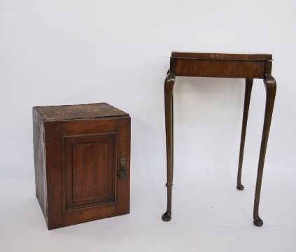 20th century walnut side table, the square top with carved corners, raised on cabriole legs and a single-door cupboard (2)