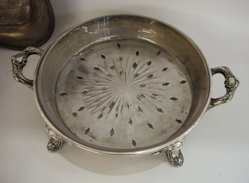 Large silver-plated tray of rectangular form with handles, two glass lined EPNS tureens, a lidded tureen and a gravy boat