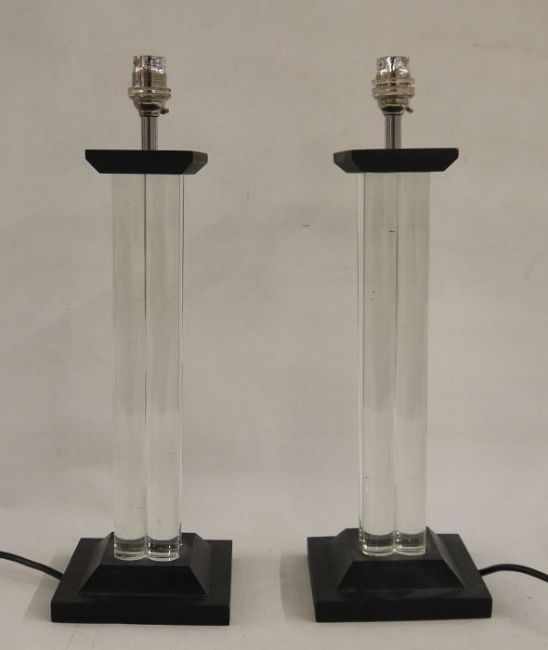 Pair of modern table lamps by David Hunt Lighting Ltd, in clear perspex quatrefoil section columns, stepped bases (2) Condition ReportHeight approx 42cm (35cm to square base of bulb fixing), base 13cm squareAppear in overall good condition, not PAT tested