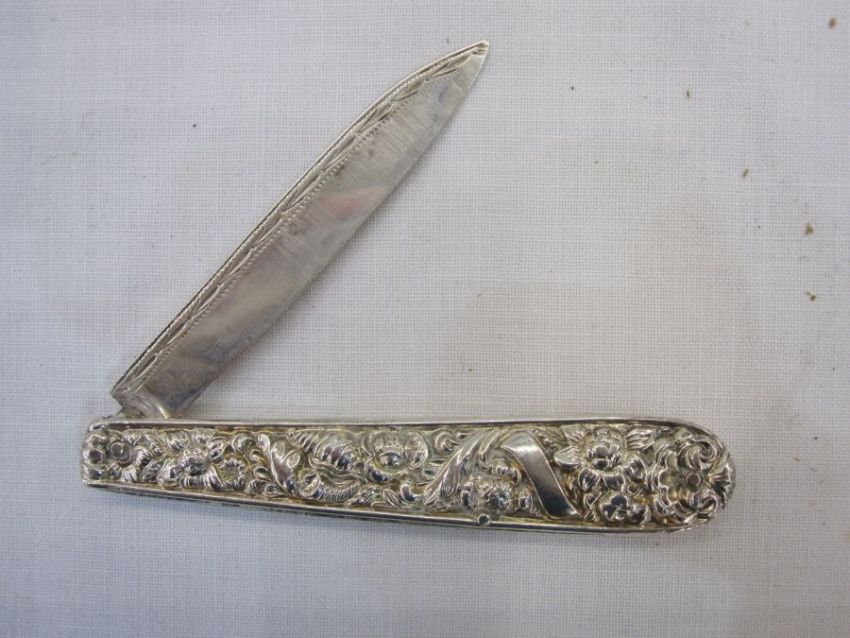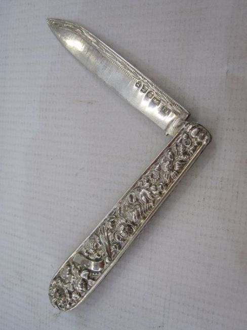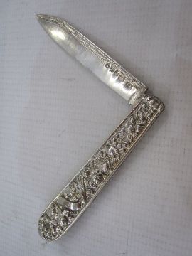 Silver folding fruit knife with ornate handle