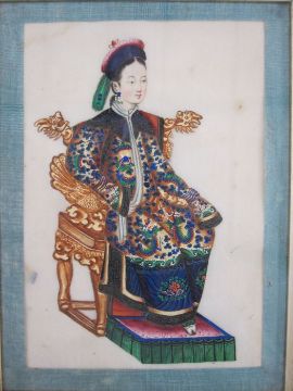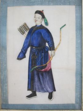 Pair of Chinese watercolour drawings on rice paperPortrait of a man standing with bow and arrows and portrait of a woman seated on gilded throne, 19cm x 14cm (2) Condition ReportSome marks/spotting to paper background of both pictures (particularly the woman) and a hairline white mark across the tunic of the male (not believed to be a cut), figures very clear and colours vibrant.