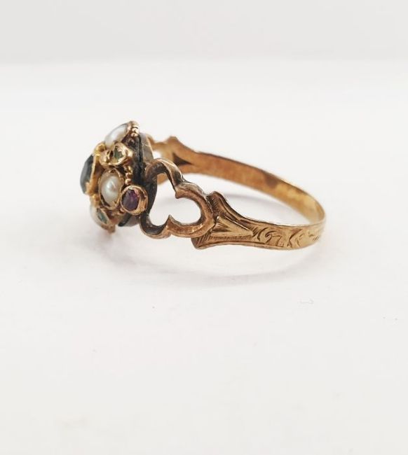Early Victorian gold ring set with four seedpearls interspersed by garnets and rubies, with engraved shank (finger size N1/2), unmarked (some damage and losses)Condition ReportNo visible hallmarking, untested
