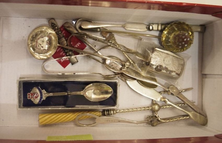 Assorted silver-plated items to include a small toast rack, two gravy boats, assorted teaspoons, pickle forks, sugar sifters, a goblet, a lidded muffin dish and a boxed set of EPNS tea knives and fish knives and forks