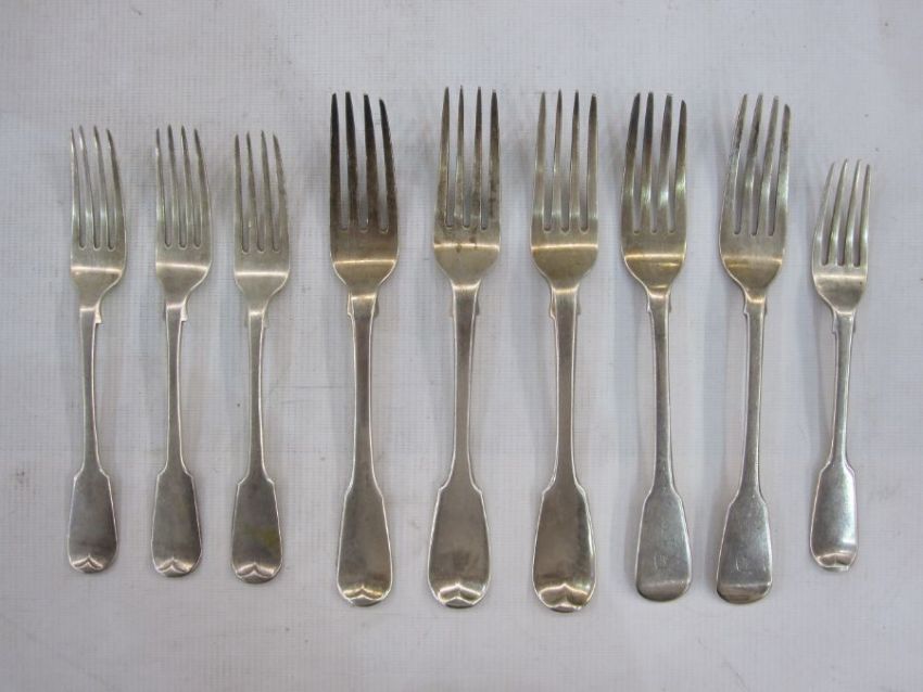 Five assorted George III and later fiddle pattern silver table forks, mixed dates and makers and four George IV fiddle pattern silver dessert forks, approx. total weight 18ozs (9)
