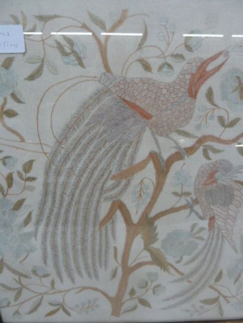 Early 20th century embroidered picture of two peacocks amongst a flowering bush, 55cm x 48cm and a 20th century Chinese embroidered silk panel, the beige ground depicting various landscape scenes, pagodas, figures, boats, etc, within embroidered border, framed, 120cm x 41cm (2)