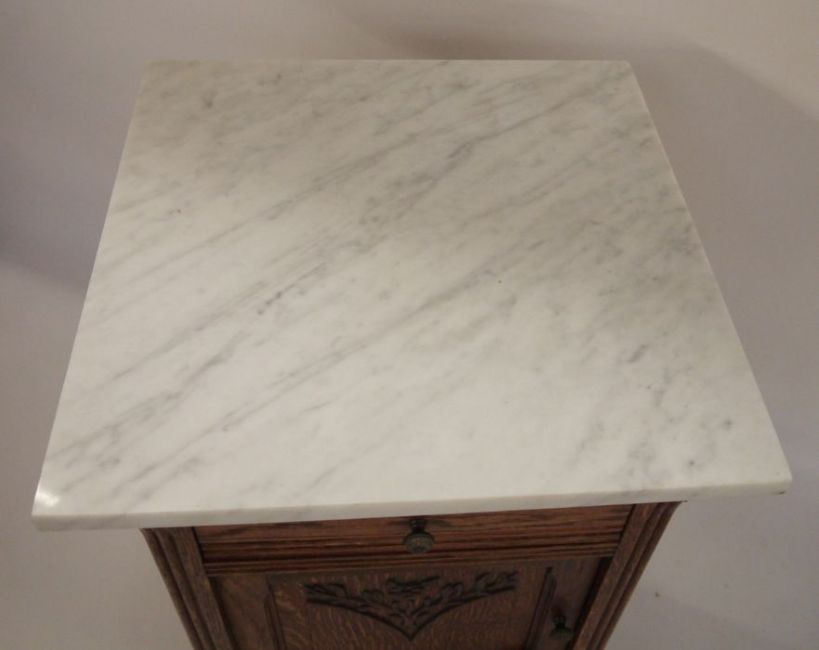 20th century white marble-topped pot cupboard on oak base with single drawer and cupboard door, turned supports to the shelved undertier, moulded edge and turned feet, 45cm x 85cm