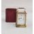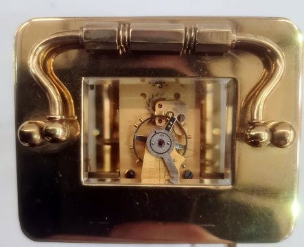 Brass and five-sided glass carriage clock in leather carry case, with Roman numerals to the dial, 11cm high