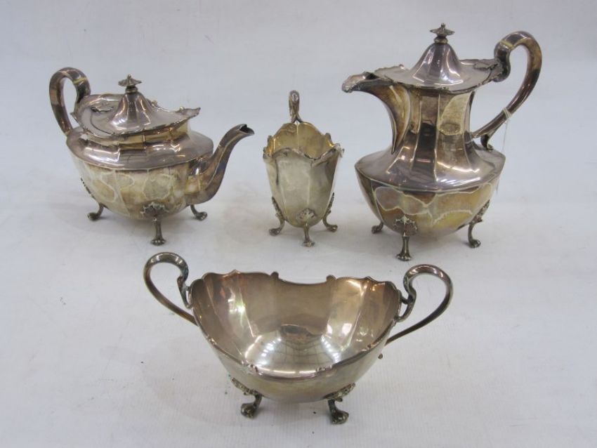 Mid 20th century four piece silver tea service, comprising teapot, hot water pot, sugar bowl and milk jug, teapot and hot water pot with ivory separators to the handles, 1943, Atkin Brothers, Sheffield, 77 oz