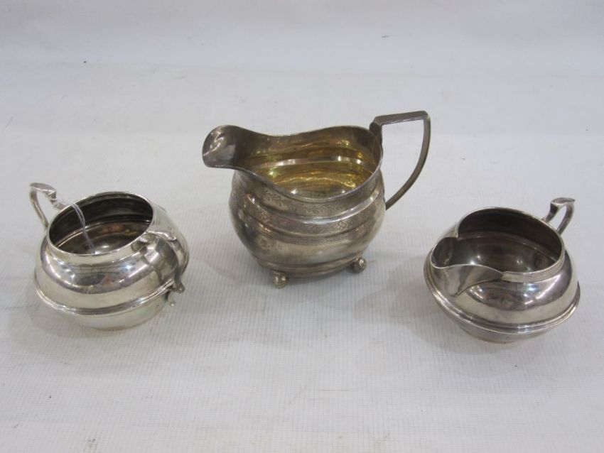 Silver two handled sugar bowl and cream jug by Charles Boyton & Son Ltd, London 1922, each of circular form with central applied girdle, total weight approx. 7ozs and a George III silver coloured cream jug with bands of engraved decoration, unmarked (3)